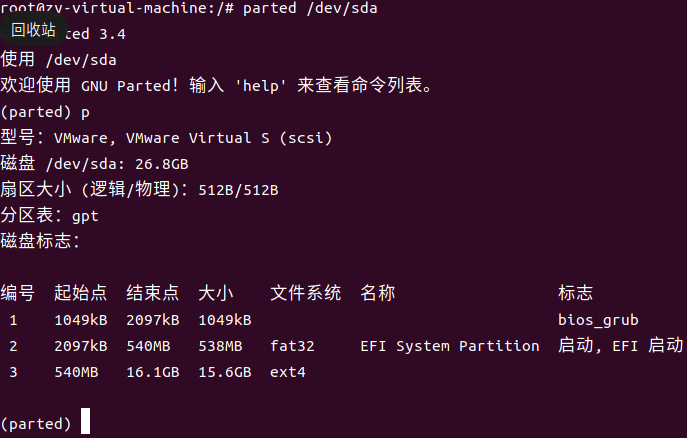 执行命令,parted /dev/sda 进入磁盘,输入p可以看分区详情