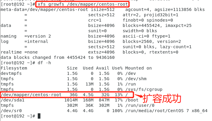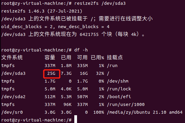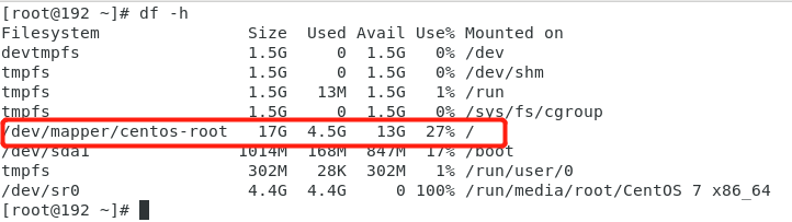 再次使用df -h命令查看,发现根目录已经扩容成功。