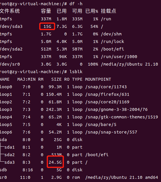 上图可见,/dev/sda磁盘目前有25G的空间,有三个分区/dev/sda1,/dev/sda2,/dev/sda3,我们需要扩容/dev/sda3而且该分区的size是15G,确定可扩容10G。