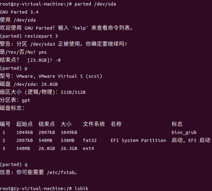 $ resizepart 3会提示根分区正在使用,是否继续,输入yes,然后提示输入要扩到多大的容量,我们也可以输入25GB,也可以输入-0,-0的意思是将剩余所有空间都分给3分区。扩完以后输入p查看分区详情: