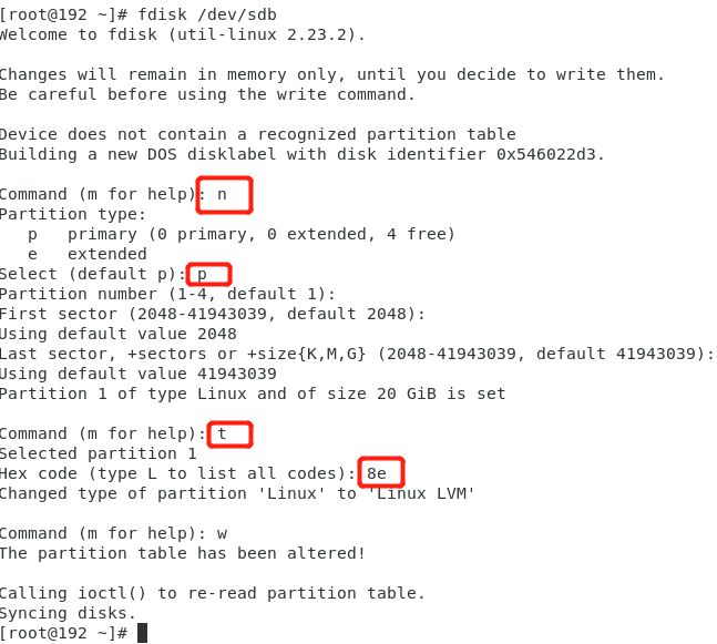 t: 修改分区文件系统id,选择8e,LVM(与原有分区一致)