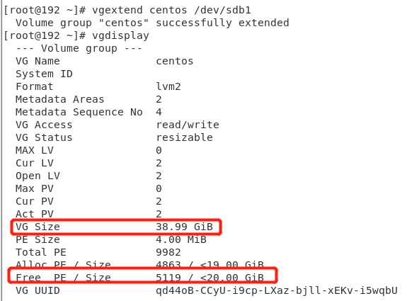 $ vgextend centos /dev/sdb1