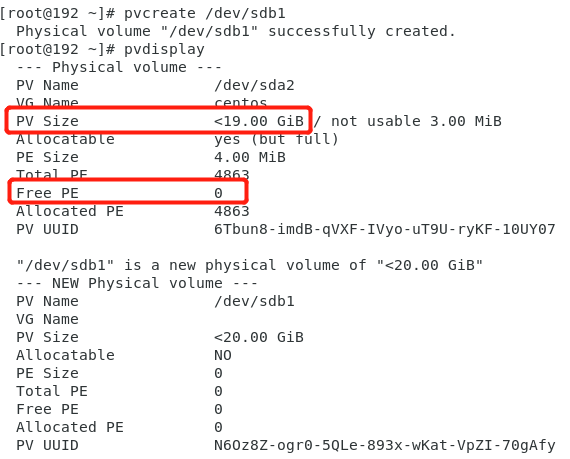 3.输入partprobe 让系统识别新增的分区,然后创建物理卷,使用pvcreate /dev/sdb1;pvdisplay查看