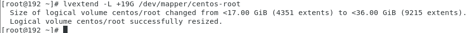 $ lvextend -L +19g /dev/mapper/centos-root